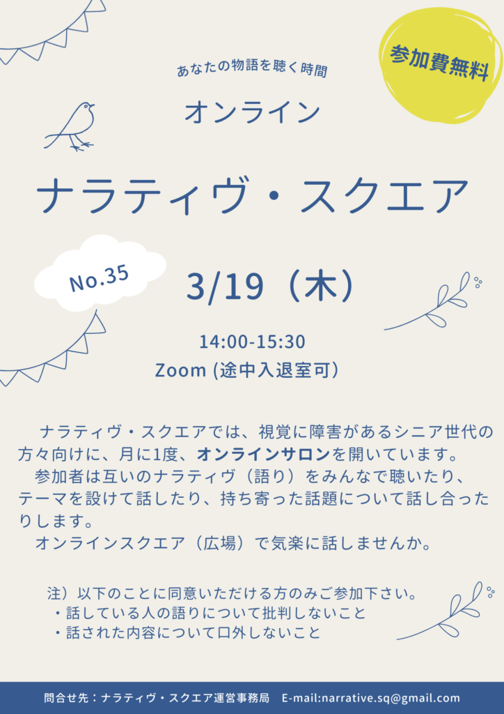 ナラティヴ・スクエアでは、視覚に障害があるシニア世代の方々向けに、月に1度、オンラインサロンを開いています。参加者は互いのナラティヴ(語り)をみんなで聞いたり、テーマを設けて話したり、持ち寄った話題について話し合ったりします。オンラインスクエア(広場)で気楽に話しませんか。